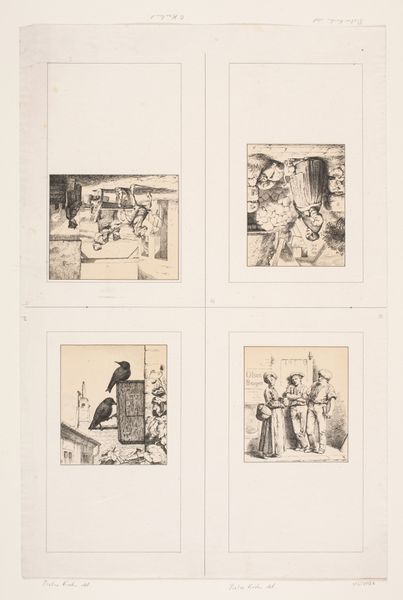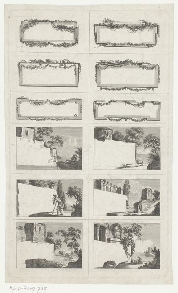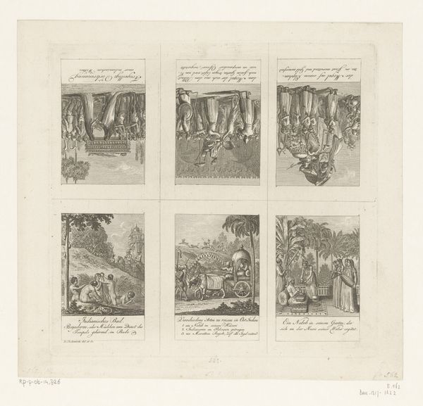 Curator: Here we have Daniel Nikolaus Chodowiecki's "Twaalf voorstellingen uit de geschiedenis van de eerste kruistocht," dating from around 1800. These twelve scenes from the First Crusade are rendered through etching and engraving, combining print and ink on paper. Editor: My first thought is the incredible detail Chodowiecki achieves with these relatively small scenes. The overall composition creates a narrative tapestry—it reminds us how much historical memory relies on circulated imagery, particularly about power and religion. Curator: Exactly. Think about the conditions under which this artwork was produced. As reproductions, engravings were inherently designed for distribution and collective viewing, which in itself democratized historical narratives, disseminating complex ideas to a broader public. How do you see this process influencing interpretations of power? Editor: Well, the material constraints immediately become visible. Each frame relies on precise lines etched with meticulous labor, demanding incredible control. Then there's the chemical process, the paper stock. The crusades were fuelled by access to resources, this art both echoes and participates in those power structures through consumption and image reproduction. Curator: Absolutely. Looking closer at some of the imagery— sieges, battles, and processions, it underscores the entanglement of religious fervor with violence and the political ambitions of various factions involved. It feels less like a straightforward account and more like a staging of ideological struggle. Consider who commissions such imagery, whose narratives it serves to reinforce. Editor: That is critical. I see each framed scene operating as a controlled exercise of narrative power, the selection, framing and printing – this controls the past through careful material action. It would be very revealing to study the origin and use of the paper on which the print was made. The availability of that stock might also subtly affect how this story can be circulated, changing interpretations across locations and income groups. Curator: True. Examining this piece, in its complete context encourages questions around historical agency, and representation that can offer nuanced perspectives on collective memory. Editor: Thinking about it this way deepens my understanding of this historical episode itself and also how interpretations take physical form and spread based on material possibilities.