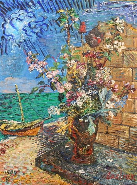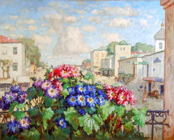 Konstantin Gorbatov painted ‘Flowers in the Window’ with oil on canvas. Gorbatov was a Russian artist, and the church in the background suggests this painting was made there. Russia's long history of icon painting and church building created enduring images of national identity. How might this connect to the way institutions such as museums, galleries, and schools shape the production and reception of art? Flowers, boats, and clouds are also visible in the painting. One might ask what the politics of imagery are when they are combined. Does this painting comment on the social structures of its own time? What historical events, social class, political movements, or economic structures might have influenced the artwork? To understand these questions, we need historical resources. We might consult books on Russian art history. By seeing art as contingent on its social and institutional context, we can better understand it.