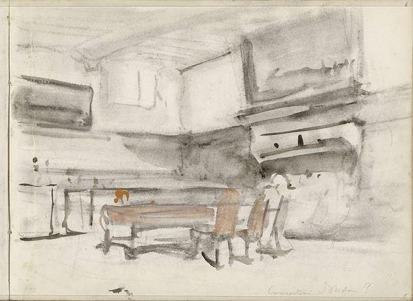 Curator: This is Cornelis Vreedenburgh’s “Figuren bij een biljarttafel,” a sketch that likely dates between 1890 and 1946, housed here at the Rijksmuseum. Editor: It’s a rapid impression, isn't it? Almost ephemeral, like a memory barely grasped. The sketchy lines create an immediacy, drawing us right into the moment. Curator: It provides a rare glimpse into a social sphere, depicting figures engaged in leisure around a billiard table. We gain insight into a specific historical context through this artwork. Editor: What strikes me is the artist’s deliberate choice of medium. A quick pencil sketch on toned paper speaks to accessibility; this wasn't about grand pronouncements but an exploration of everyday materials. It's work, isn't it? Sketching for practice. Curator: Absolutely, this piece offers insight into social dynamics. Note the dress of the figures and how their arrangement around the table dictates interactions and hints at social stratification in that time period. Editor: And there’s also the undercurrent of leisure as a constructed performance. The arrangement, the posed figures, everything suggests the social act of taking part in it, made from pencils, paper, and the artist's skillful observation. Curator: Vreedenburgh’s choice to depict this kind of everyday life elevated a scene not traditionally considered worthy of artistic attention, reflecting a shift in artistic values towards realism and impressionism. Editor: And let's consider what it means to be 'incomplete'. Its roughness is its strength, it’s unburdened by the weight of perfection. This artwork highlights how value can reside in the process, in the artist’s mark making. Curator: Seeing this through your materialist lens highlights a different approach. It certainly prompts us to reconsider traditional art historical narratives. Editor: Indeed, this sketch invites us to acknowledge and appreciate the beauty in the unrefined. The means and methods that goes in it. Curator: I concur; examining “Figuren bij een biljarttafel” allows us a broader understanding of art's function in portraying, shaping, and, as you suggest, capturing life. Editor: It truly opens a space to challenge our expectations. It underscores that every artwork contains rich, raw creative insights.