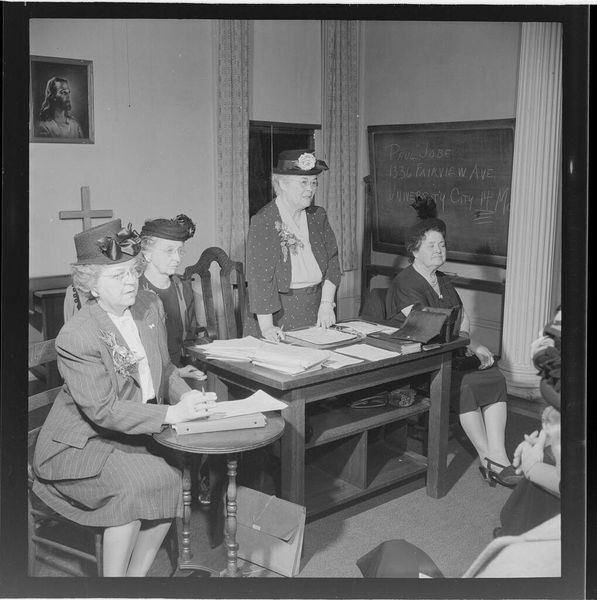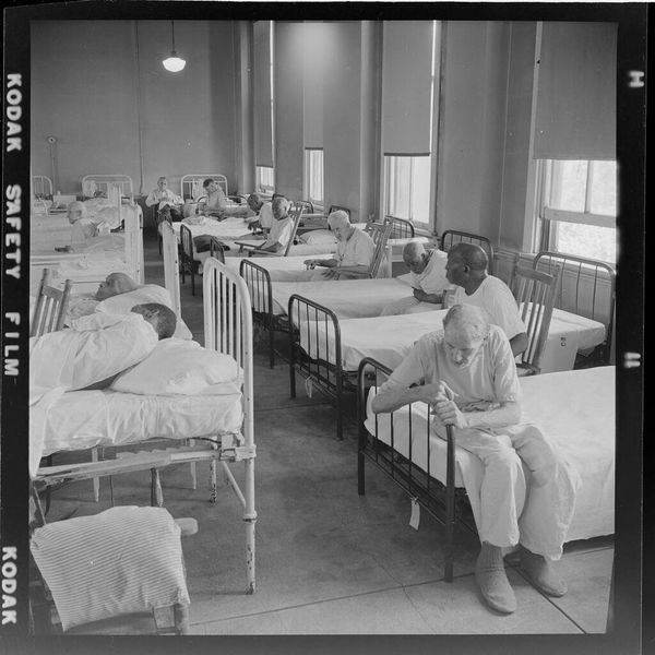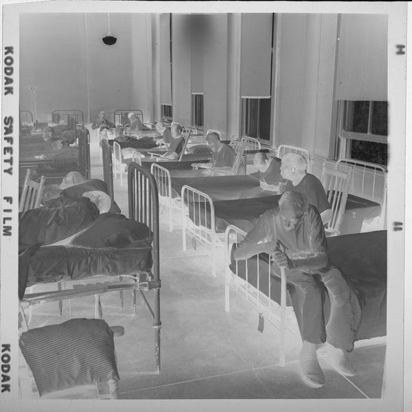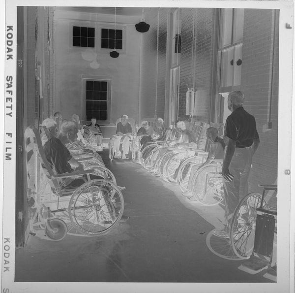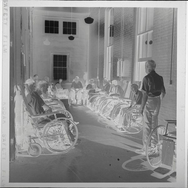 Curator: Jack Gould’s Untitled photograph presents a scene of hospital patients in wheelchairs; its dimensions are approximately 6 by 25 centimeters. Editor: The immediate feeling is one of quiet resignation, a stillness amplified by the repeated forms of the wheelchairs. Curator: Precisely. Note how the artist uses the grid of the windows and brickwork to reinforce a sense of regulated space. The composition is structured, yet subdued. Editor: Yes, and the wheelchairs themselves become symbols of confinement, their identical designs suggesting a loss of individual agency within the institution. One might say, this is an image of societal marginalization. Curator: I'd argue the formal repetition creates a visual rhythm. The subtle gradations of light and shadow across the surfaces are what truly capture the eye. Editor: Perhaps both are true. It certainly provokes thoughts on human vulnerability. Curator: An interesting perspective, and the formal techniques enhance that sentiment. Editor: Indeed, a memorable image that invites deeper reflection on institutional spaces and the human condition.