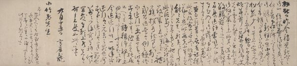 Curator: This delicate drawing is known as "Letter to Murase Heijirō" by Rai Baishi, dating back to the 19th century. It’s rendered in ink on paper. Editor: The density of the calligraphic marks creates such a layered texture; the surface almost vibrates with implied meaning! It's interesting how writing itself can become a visual object. Curator: Precisely! Rai Baishi was a master calligrapher and painter of the Edo period. Letters like these were not merely utilitarian but important cultural expressions. Social class played a big role in art consumption. Editor: And I'm especially interested in the paper itself. Was it specially made? The consistency of the paper's surface, its absorption of the ink—the way materials would affect the making process fascinates me. I see the relationship between artist and suppliers like printers to affect artistic innovation. Curator: That's a key point! Access to high-quality paper certainly impacted artistic possibilities. The art of papermaking was integral to the culture surrounding calligraphy. A piece like this one displays status, the recipient’s as well as the maker's. Editor: Considering paper production, how the ink was mixed, or even the source of the artist’s brushes can all give insight to a particular production value and aesthetic impact in the artist’s style, can it? Curator: Absolutely. Baishi would have had a team or at least apprentices involved in some capacity for the material's sourcing and/or production, it makes me want to question who and how many people did the writing actually represented. It all relates to the social ecosystem of artmaking. Editor: So in examining even something that looks as "simple" as this, we reveal entire social networks built around the creation, transmission, and reception of art and commerce, the whole world inside one artwork. Curator: It becomes a cultural artifact, connecting us to the history of the materials. What a marvelous web!