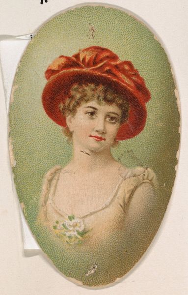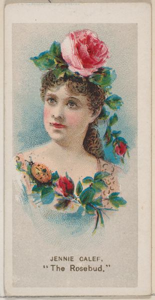 Editor: This is "Marie Jansen in costume of French maid in 1800," a print from around 1888 or 1889 by W. Duke, Sons & Co. It’s made with colored pencil, and it’s a charming little portrait. It's hard to miss how this print comes from a set of cigarette cards; I wonder, what kind of impact do you think the medium had on the art itself? Curator: Well, consider the purpose. These cards were essentially promotional materials, designed to be collected and traded. The image of Marie Jansen isn't just a portrait; it’s a commodity, bundled with a product – tobacco – for mass consumption. What does the print’s origin as part of a manufactured set of collectibles suggest to you? Editor: It definitely blurs the lines between art and advertising. It was meant to be circulated and almost, well, used up, as part of the act of enjoying tobacco. Curator: Exactly. The “high art” of portraiture is thus democratized and dispersed into everyday life through cheap print production and tobacco consumption. Look at the drawing, colored pencil. Consider that the artist probably aimed for accuracy to get a lifelike impression in mass-produced objects. The aim for verisimilitude made for wider consumption and increased sales of cigarettes. Is Jansen represented respectfully here, do you think? Editor: I'm not sure if "respect" is really the point. It was a commercial transaction, plain and simple. She's essentially an image to sell cigarettes. What do you make of the subject, a celebrity in a "genre" costume? Curator: She's an actress presented in a consumable format for advertising purposes, yes, but does her work also add a bit of respect to the image on this trading card? Editor: That's a fair point. So, instead of thinking about a painting hanging in a gallery, we are looking at a trade card designed to circulate in pockets and promote sales. Thinking of it in terms of its means of production really opens it up. Curator: Absolutely. Considering its material existence and context really underscores how art functions within systems of labor and consumption.