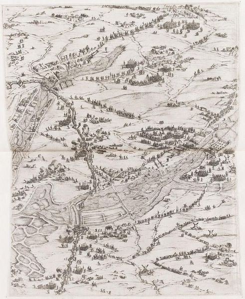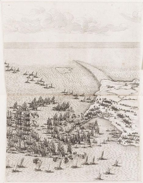 Editor: This is Jacques Callot's "Siege of La Rochelle." It seems like an engraving, maybe from the early 17th century. The detail is incredible! What's your interpretation of this piece? Curator: Look at the labor involved in producing this image! The etching process itself, replicating this scene, highlights the act of documentation and control. Consider how this image served as a form of propaganda, shaping perceptions of power and victory through its careful construction and distribution. Editor: So, it's less about the artistry and more about the process and its impact? Curator: Precisely! And how the image's materiality – the ink, the paper – enabled its circulation and reinforced certain ideologies. We must ask, who consumed this image and what purpose did it serve? Editor: That's a really different way to look at art. Thanks! Curator: Indeed. Thinking about art in this way helps reveal the powerful social and political forces at play.