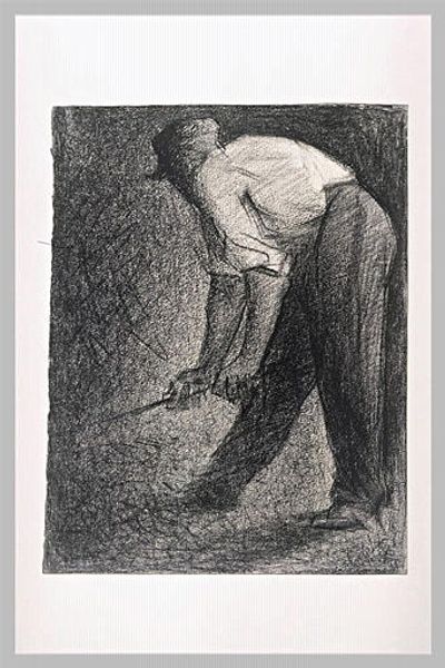 Curator: This is Vincent van Gogh’s “Reaper with Sickle (after Millet),” created in 1881 using charcoal and pencil. It’s currently held in a private collection. Editor: It has a certain humility. The bowed figure, almost engulfed by the wheat field… It feels less like observation and more like a lived experience, translated into this study of brown tones. Curator: It's directly inspired by Millet's work, part of Van Gogh's larger project of studying and copying other artists to find his own voice. The reaper archetype is obviously very ancient, the symbol of harvesting having profound significance. Think of Cronos. Editor: You see, that stooping pose is key here. Van Gogh emphasizes the line of the back, the bend of the legs...It’s the fulcrum of the entire composition, creating a clear spatial depth, and giving that posture preeminence as the most important part of the sketch. Curator: Right, but let’s think about that symbolism: this image evokes themes of life cycles, mortality, and humanity's connection to the land, all magnified by the looming reaper. The flock of birds hints at vulnerability. We become increasingly aware that Van Gogh often uses avian imagery to hint at something deeper. Editor: Vulnerability? Or vitality? Those birds could be a formal device, simply adding another, lighter tone and scattering detail across the upper register of the image to counter the dark, heavily worked figure. Curator: Perhaps both? Van Gogh was never simplistic. And the fact that this is "after Millet" is crucial. It is cultural memory being reworked to his own artistic vision, the Post-Impressionist style applied to social realism—the everyday labour transformed by emotional depth. Editor: Well, whichever perspective we embrace, the undeniable energy in this charcoal sketch pulls you right into the frame. It stands alone formally and symbolically, whether or not you’re familiar with Millet. Curator: Exactly, it offers multiple interpretive paths, but at its core remains a timeless image of labour and nature. Editor: Yes, it’s truly something to witness his interpretation of another master—seeing Van Gogh himself in this brief but dynamic rendering.