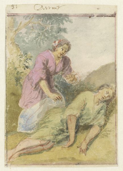 Editor: Here we have "Flauwmoedigheid," a watercolor drawing by Pieter van den Berge, created sometime between 1675 and 1737. I’m struck by how subdued the colors are, and the figure seems… defeated. What symbols or ideas do you see at play here? Curator: The figure's dejection speaks volumes, doesn't it? The armor, traditionally a symbol of strength and protection, here becomes a burden, an ironic counterpoint to the downcast eyes and the limp hand. What do you make of the discarded sword? Editor: Well, the discarded sword seems to obviously represent the rejection of aggression, maybe even resignation. It makes me wonder what this warrior fought for and why they abandoned the cause. Curator: Exactly. Think about the tradition of depicting virtuous figures – the sword is usually a symbol of justice and power, yet its abandonment might represent the futility of violence. Could this “faintheartedness,” as the title suggests, be interpreted as wisdom or even pacifism, a rejection of worldly conflict for a higher ideal? Look also at the shield. Editor: It’s turned away, so we only see the back. Almost as if to indicate vulnerability or that they aren’t using it. Does that communicate something specific? Curator: It may mean the same abandonment or resignation. It also might reflect the time period, filled with wars and shifting power dynamics. This symbol of weariness resonated in van den Berge’s society where courage and cowardice weren't straightforward. Editor: That gives me a lot to consider. Thank you. I see more layers to the image now. Curator: And I appreciate your fresh perspective. These images evolve over time.