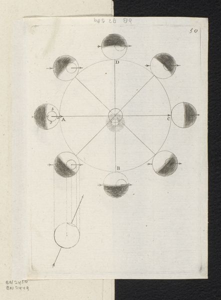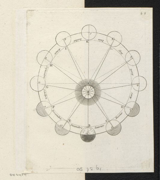 Sébastien Leclerc I created this engraving of "Earth and Sun during the Four Seasons" sometime between 1637 and 1714. At first glance, the composition appears to be a simple diagram, but it's really a carefully constructed representation of celestial mechanics. The stark contrast of lines against the white paper immediately draws us in. The geometric shapes and the precise arrangement of circles and lines create a sense of order. However, the diagram also hints at something more complex. The sun and Earth are depicted twice, which gives the work a sense of movement and change. The engraving reflects broader artistic and philosophical concerns of its time, and the use of a semiotic system allows us to interpret the cultural codes of the era. The artwork challenges our fixed notions of space and perception, while also engaging with new ways of thinking about representation. The precision and attention to detail invite ongoing interpretation and reinterpretation.