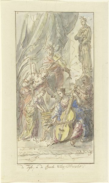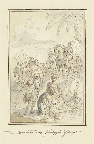 Curator: Here we have Elias van Nijmegen’s “Marcus Curius Dentatus Visited by the Samnites,” a pen and ink drawing from the late 17th to mid-18th century. Editor: It’s a busy composition, full of figures draped in classical robes. The man sitting seems to be the focal point. What do you see in this piece that perhaps I’m missing? Curator: Beyond the immediate narrative, which illustrates Dentatus's incorruptibility, consider the deeper symbolic weight. The Samnites offer him riches, right? What do riches signify across cultures and throughout history? Think of the golden calf, the forbidden fruit… Editor: Temptation? The fleeting nature of worldly goods versus the solidity of character? Curator: Precisely! And note how van Nijmegen positions Dentatus beneath the tree, a classical motif suggesting wisdom and steadfastness. The tree, culturally, symbolizes life, knowledge, and a connection between heaven and earth. Is he elevated, grounded, or both? Editor: Both, it seems. He's offered earthly riches, but he's symbolically rooted in something greater, something timeless. What’s being tilled on the ground? Curator: Ah, there we have a detail rich in symbolism: agricultural work. Curius Dentatus preferred his simple farm life, underscoring Roman ideals of virtue found in labor and a rejection of decadence. He is portrayed in the act of declining their gifts and literally pointing back to his field and daily life. The implication is the strength and fertility of Rome are in the land. Editor: So, it's not just about personal incorruptibility but also about the source of Rome's power and virtue? The symbolism paints a broader picture. Curator: Indeed. Van Nijmegen uses this historical anecdote to comment on values. The drawing reminds us that images aren’t merely representations; they’re vessels carrying cultural memory and ideals. Editor: That makes me see this less as a historical scene and more as a commentary on enduring values. Curator: Exactly. Art invites us to unravel those threads of meaning.