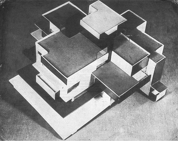 Editor: Right, so here we have Theo van Doesburg’s “Model of artist’s house,” created in 1923 from wood. It’s a striking collection of geometric forms that remind me a bit of a puzzle box…a really austere one! How would you interpret this work? Curator: Puzzle box is spot on! It is that tension between playfulness and cold geometry that intrigues me, you know? Van Doesburg, a central figure in De Stijl, wasn’t just designing a building. He was, in essence, proposing a new way of living, thinking, *being* through pure abstraction. Imagine the guts it must take to push for that radical vision? Editor: Absolutely. It is pretty revolutionary... like nothing else from the period. Do you think he saw it as a functional space or something more symbolic? Curator: That's a layered question, isn't it? De Stijl aimed at a universal aesthetic language; architecture freed from the baggage of history or personality. But doesn't a home always betray its inhabitant in some subtle way? I see the ghost of that tension. Think about how such severe angles would affect the light. Would the lack of ornamentation foster contemplation or claustrophobia? Editor: Wow, I never considered that, thinking about the actual light hitting the sharp edges! It does make me think more deeply about the potential impact it might have on daily living. Thanks! Curator: My pleasure. Remember, art often resides not just in the creation, but the questions it inspires, wouldn't you agree?