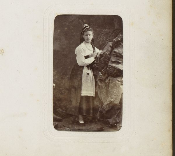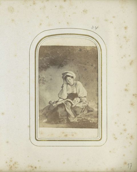 Curator: This daguerreotype, created between 1865 and 1891, is titled "Portret van een acteur, zittend in een decor van een landschap, aangeduid als Michael Aagaard" by Georg Emil Hansen. It’s quite striking, don't you think? Editor: It's sepia-toned, stagey. The light and composition seem carefully calibrated to create an impression of pastoral charm. Curator: Precisely. Hansen worked extensively as a photographer for the Royal Danish Court. The albumen process evident in the print involved meticulous preparation—the coating of the paper, its exposure, development. The materials used clearly allowed Hansen to capture this fine tonal range. Editor: The actor’s pose feels unnatural and forced against that background; how much of this staged image can be seen as truthful? Consider his attire; it looks specifically chosen. Its construction details speak to both costume and a specific role the actor sought to convey. Curator: The combination of his somewhat absurd, but clearly high-quality garb, and the rustic scene is definitely an indicator of his chosen role; one that probably alludes to rural aristocracy. And while the backdrop creates a constructed scene, the quality and craftmanship that Hansen devoted to photography are, for me, where it shows its strengths. It isn’t simply a captured image; it's a produced artefact. Editor: Yet, to me, there's a tension between the reality of photographic detail and this highly artificial setting. This tension creates something unique, an uncanny, haunting realism that belies the romantic aesthetic. It speaks of the human desire to fashion idealized versions of themselves. Curator: The portrait hints at the socio-economic context of theater and photography at the time. Actors occupied an unusual space within the labor structure—performers, and public figures. His appearance reflects both his occupation and his ambitions. Editor: Very true. It does indeed reveal so much when one stops simply looking and truly scrutinizes what's presented. I'm taken again by the textures present: from the softness in clothing to the crisp details of nature. Curator: Seeing this portrayal through its various physical and conceptual layers illuminates both historical circumstance and a specific desire for social ascension. Editor: Ultimately, regardless of intent, we are gifted with this haunting, strangely compelling photograph—its careful details making me reflect on timeless elements of composition, representation, and form.