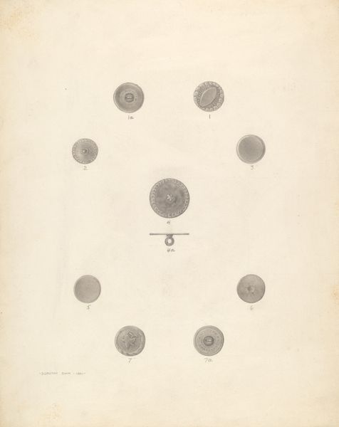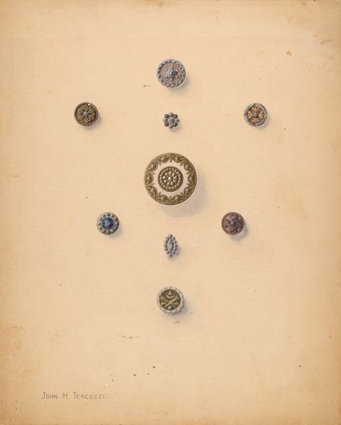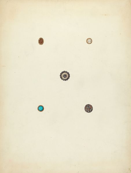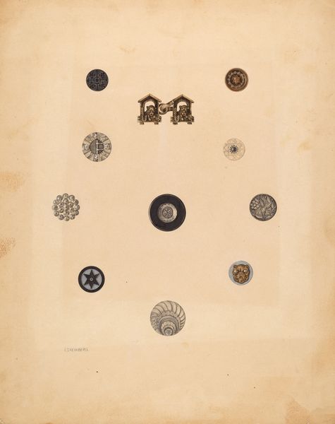 Mary Fitzgerald made this drawing of ‘Buttons’ at an unknown date, probably using pencil and watercolour on paper. These little studies of buttons are like a colour chart, or a guide to the material world in miniature. Look at the way she has built up the tones in each example, a kind of optical mixing that gives each button a subtle vibrancy. I really get a sense of the hand here, the artist’s patient, methodical way of building up the image. The colours are understated, but there’s a real feel for the texture of each button. Look closely at the lower left, the turquoise one, surrounded by a beaded trim. You can almost feel its glassy surface and the way the light catches it. It reminds me of Vija Celmins’ drawings of stones and shells, where the act of observation and the slow, repetitive mark-making blurs the distinction between the object and the image. It’s like Fitzgerald is reminding us to slow down, to really look, and to appreciate the beauty in the everyday.