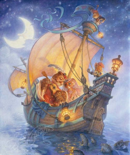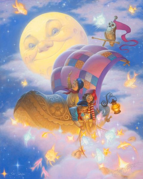 Curator: Let’s turn our attention to "Carpet to Adventure" by Scott Gustafson, a whimsical watercolour illustration. Editor: Oh, it’s instantly charming! The cool blues and purples create such a dreamy, fantastical atmosphere. I’m immediately drawn to the textures—the scaly dragon, the plush carpet… Curator: Exactly! It presents a wonderful merging of cultures and myths. Look how Gustafson utilizes figures from Middle Eastern folklore juxtaposed with a European dragon, suggesting the globalization of children’s stories and fantasy narratives. Editor: Absolutely, and speaking of the carpet itself, consider its material presence. Its manufacture would likely have involved many artisans, their labor woven into its very fabric before it was recontextualized as a portal to fantasy by Gustafson. I mean, think of the social implications embedded even in this single element. Curator: Interesting point. I am more captured by the tiger-like figure holding that glowing orb. Its role as guide or master aligns with archetypes we see across children's literature and stage magic, influencing audience expectations. Editor: For me it raises interesting questions. What kind of artistic process led to this fantastical creature? Did the artist carefully blend pigments for the watercolor? And, again, that dragon – I can almost feel the texture of those painted scales and imagine the labour involved in its crafting through painting techniques! Curator: Indeed, these elements all converge within the established visual tradition of children’s fantasy art, impacting its continued development in galleries and wider society. It fits neatly into our collective understanding. Editor: But at the same time, the materiality of the watercolor technique shouldn’t be discounted. The medium adds a layer of craft. Watercolor on paper feels less grandiose somehow. The accessibility helps bring that fantasy world a bit closer. Curator: It seems to achieve exactly what fantasy art should; the painting style beckons you into a comforting sense of adventure. I agree on that, even while observing its market and wider consumption of popular arts. Editor: Absolutely, there’s real thought behind both form and function here. It reminds us that artistic fantasy has a tangible existence beyond just imagination; someone had to sit and make this and somebody is paying good money for it, its production involved materials and process that involved multiple industries to sustain and give value to it. Curator: Well, I suppose in looking at fantasy illustration through differing perspectives, we both arrive at an understanding of just what makes it such an enduring art form. Editor: Indeed, a confluence of narrative, market context, skilled construction…it’s a compelling mixture to consider.