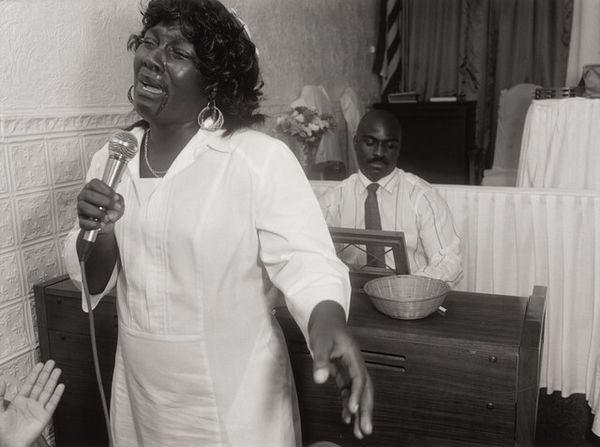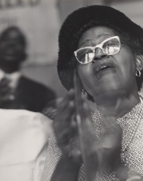 Editor: So this is an untitled photograph by Thomas Roma, created in 1992, using the gelatin-silver print technique. It has a very intimate feel, like we are intruding on a private moment, yet also communal in its expression. What can you tell me about it? Curator: The process is key here. Gelatin-silver prints are fascinating because they are born from a very specific historical moment of industrial chemistry and photographic practice. Looking at the material production, how does the specific manipulation of light-sensitive emulsion impact the visual texture and emotional weight of this image for you? The tonal range from deep blacks to bright whites really grabs your attention. What would it communicate using more modern technologies? Editor: That's a good point. There is something unique about its visual impact, it's hard to achieve that with digital photos today. Curator: Absolutely. This print isn’t just capturing a scene; it's capturing the material reality of photography itself, as a commodity and an art form. Furthermore, note the community portrayed. How does the act of photographing—the labor and intent behind Roma's lens—affect how we interpret this moment of cultural celebration, or perhaps spiritual practice? Does it feel exploitative, documentative, or something else entirely? Editor: That's an angle I hadn't considered. Thinking about it now, the act of photographing it feels delicate. It is not about exploiting, but representing a community’s deep sentiment. Curator: Indeed. The 'how' and 'why' something is made are just as vital to understanding it as the 'what'. Editor: Thank you. It's helpful to think beyond the image to the artist’s intention and the historical background behind it, in appreciating art pieces like this one.