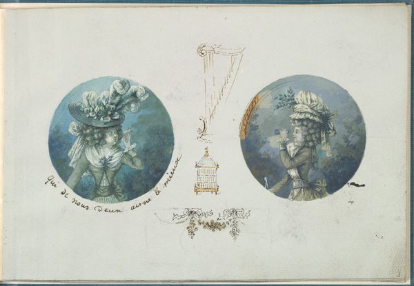 These Two Costume Designs or Portrait Types of Two Women with Straw Hats were made by an anonymous artist. The work presents a glimpse into the fashion and societal roles of women during its time. The subjects, adorned in elaborate straw hats and wigs, are framed in circular vignettes, reminiscent of porcelain portrait miniatures. These details reflect the emphasis on appearance and status in the lives of upper-class women. The artist has created not just images, but types, reflecting societal expectations of women, which were often confined to appearance and presentation. The delicate watercolors and meticulous attention to detail speak to the complex layers of identity, performance, and visibility that these women navigated. The work offers an intimate look at the visual culture that shaped and mirrored the lives of women, capturing both the artifice and the artistry inherent in their constructed identities.