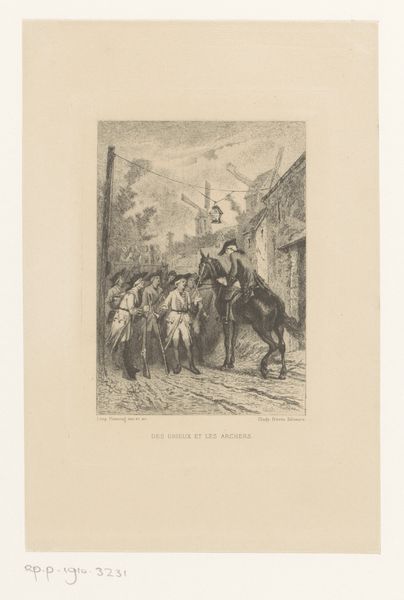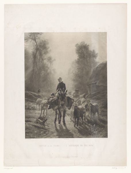 Curator: Well, if it isn’t “Schaapherders met lastdieren,” or "Shepherds with Pack Animals," an etching print created by Léon Gaucherel sometime between 1835 and 1886. Editor: It feels...dusty. Not in a bad way. More like an old memory. It's all so monochrome and hazy, you can almost feel the wool of those sheep. A long, long, time ago. Curator: Indeed. Notice the intricate lines and the texture Gaucherel achieved with etching. The density of the marks describes form but also affects the overall luminosity and atmosphere. The formal arrangements give this the overall impression of… a pastoral march. Editor: Right? The light feels so soft and distant and makes the edges all soft like an ancient fairytale. I'm not sure who's in charge; all the people are anonymous blobs, they are not the subject but merely an element in a bigger natural painting, which somehow adds to the nostalgia I am perceiving. Is there an idealisation to be gleaned here? Curator: That’s interesting because if you look at how he renders depth and distance by altering the size and definition of each stroke it gives the image depth of space while reinforcing an allegorical plane, perhaps alluding to time’s passage. In short, I agree, the image resonates as if to some ancient epoch, far removed from any industrial production. Editor: Perhaps the piece suggests an appreciation for an ancient way of life now disappeared? It feels like a tribute more than a depiction; even the title written beneath sounds more poetic than descriptive, which somehow confirms the emotional mood of the piece, and is not the first time with printmaking pieces of art; artists use printing to distribute nostalgia through melancholic compositions like this one, I'm just sure. Curator: Well said. The interplay between the dark, assertive strokes defining the trees and the lighter, subtler etching across the path definitely amplifies such emotions in what is certainly a poignant contemplation on the human relationship to our world. Editor: Yes, thank you. An ode from yesteryear, then.