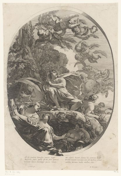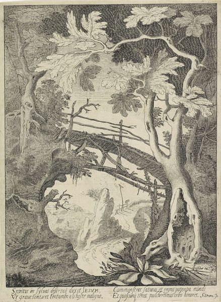 Curator: Frederick Bloemaert's etching, "Landscape with a Hermit Praying," likely executed between 1566 and 1674, presents a rather striking scene. Editor: The first thing that hits you is this dense network of roots enveloping what seems to be an old, brick structure. It's almost gothic in its moodiness, even with the hermit tucked away in prayer. Curator: Indeed. Consider how Bloemaert structures the composition. The gnarled tree dominates the foreground, its form echoed in the subtle curve of the distant hills. Notice also the sharp contrast between the textured bark and the smoothness of the sky—the interplay of line and shadow adds depth and dynamism to what would otherwise be a simple devotional image. Editor: But look closely at those roots! Bloemaert clearly spends an enormous amount of effort on the detail of these materials. You can almost feel the coarseness of the bark. This intricate detail points to the physical labor involved in the artist's meticulous crafting. He makes use of crosshatching and stippling which shows labor and skills in etching. Curator: From a stylistic point of view, this etching shows Baroque qualities, it embodies a clear emphasis on dynamic movement, deep contrast, and dramatic symbolism, typical for the period, while simultaneously integrating subtle religious connotations and historical narrative. Editor: That hermit, for instance. Though small, his inclusion transforms a mere landscape into something more profound. I am curious about who produced the paper on which this print appears and where those raw materials came from! This is a great print of a great tree! Curator: That being said, reflecting on Bloemaert's control of the medium reveals the careful composition of "Landscape with a Hermit Praying." The structured placement of each element makes you want to reflect on each minute detail, bringing a calming sensibility. Editor: I'm most drawn to thinking about what these organic materials would have been like in a physical and social sense and, I wonder, how his workshop functioned in society and contributed to the wider world of Baroque art.