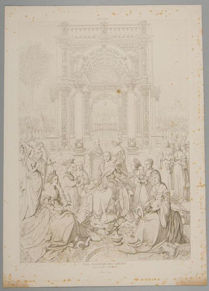 Curator: What strikes me immediately is the ethereal quality of this image; it's all lines, almost like a preparatory drawing for something grander. Editor: Indeed. Here we have Samuel Amsler's "Triumph of Religion in Art," held in the Harvard Art Museums. It's fascinating as a reflection of 19th-century artistic and religious ideals. Curator: The composition is meticulously organized. The balanced symmetry, the classical lines – it all reinforces a sense of order and divine harmony. Notice the figures arranged in tiers. Editor: And these tiers represent a hierarchy, clearly placing religious figures at the apex, above the more earthly mortals below. One wonders about the implicit power dynamics in such visual arrangements. Curator: Perhaps, but Amsler's delicate use of line also conveys a certain humility and reverence. The lack of color focuses us on the structure, the essence of the scene. Editor: A structure which served to reinforce the Church's influence and moral authority, shaping public perception of faith and its role in society. Curator: I see your point, but one can also appreciate the sheer technical skill on display here. The intricate details, the balanced composition... Editor: It is a powerful visual statement about the role of religion shaping society. Curator: A statement rendered with remarkable clarity. Editor: A clarity that perhaps obscures as much as it reveals about the complexities of faith and power.