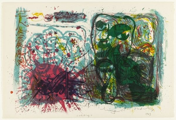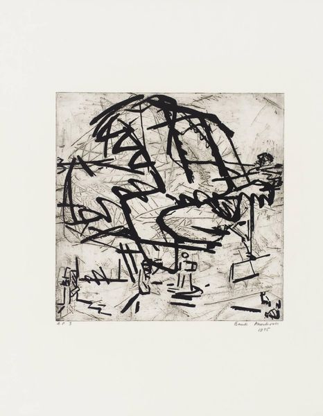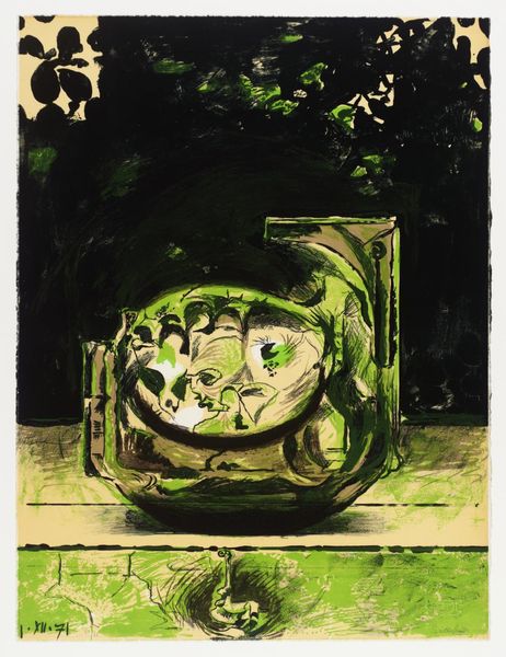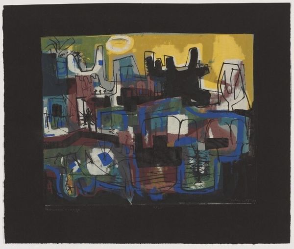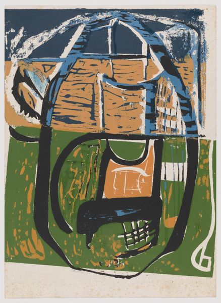 Editor: So, we're looking at Peter Lanyon's "In the Trees" from the Tate. It's quite abstract, with bold black lines against a textured green. It feels like a memory of a place, rather than a literal depiction. What do you make of it? Curator: It's a feeling, isn't it? Lanyon's Cornish landscapes are always so deeply felt, almost visceral. I see the influence of the coast and the windswept trees—that horizontal line dividing the canvas could be the horizon itself. Do you sense that connection to place? Editor: I do, now that you mention it. The green could be the fields, and the black, gnarled branches reaching up. Curator: Exactly! And notice how the abstract shapes almost become figures, lurking within the landscape. It's a dance between abstraction and figuration, memory and place. Editor: That interplay is fascinating. I'm definitely seeing more than just a pretty picture now!