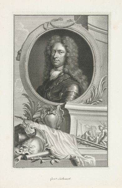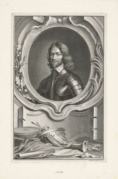 Curator: The first thing I notice is this remarkable sense of weight. It feels serious, you know? Even stern. Editor: Well, this is Jacob Houbraken’s 1740 engraving, a print called “Portret van Charles Fleetwood,” residing here at the Rijksmuseum. It is, after all, a portrait of a military man, which may explain the gravity. Curator: True, but it goes beyond the subject matter. Look at the density of the lines, especially in the armor, but it really goes further. The engraving, so crisp and deliberate...it’s not just *representing* authority; it *embodies* it, literally pressed into the paper! Editor: You’re keying into something important here, actually. Houbraken was a master engraver, and prints like this were, in their day, a powerful form of dissemination. Think of the labor involved! Every tiny line meticulously carved into a copper plate, replicated hundreds, maybe thousands, of times! Curator: Exactly! It’s almost as though the weight of history, the gravity of power, is etched right into the material. That meticulous craft really drives home the image of Fleetwood as someone, like the material itself, unyielding, inflexible. It’s also ironic - here is a tool, a print, that disseminates a subject so he becomes consumed, objectified. Editor: Interesting point. And the symbols! The lion, of course, and the draped fabric all amplify Fleetwood's position. And note the contrast – that rigid armor against the softness of the lion's fur. Curator: It really asks the question: can anyone actually live up to that image? Are the laboring and consumptive bodies forced to emulate these standards of being? In essence, this man is made icon through work. And it gives me so many more questions that it gives answers. Editor: Yes. The portrait of a man immortalized not only by the engraver's skill but also by the material reality of its creation. An object produced by, of, and perhaps for, an elite. Curator: Thinking of it that way helps bring Fleetwood's story down from its pedestal, in a way. We start to see the hand in his construction, and the choices that were made to render him larger than life. Editor: Exactly. Art for its power.