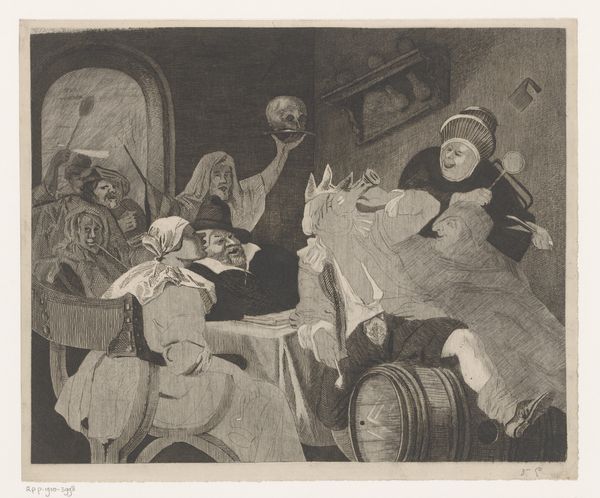 Louis Jaugey created this etching, "Feestend gezelschap met een drinkende man met kroon," which translates to "Festive company with a drinking man with a crown," in the late 19th century. Jaugey captures a raucous, dimly lit gathering with a kingly figure at its center, indulging in drink. His elevated status is mocked by the introduction of a skull, a vanitas symbol reminding us that death is the great leveler. It's hard not to consider the class dynamics at play. Do we see a critique of power, or perhaps, an acknowledgement of mortality that disregards social hierarchy? Are we meant to identify with the revelers or judge their excesses? This scene resonates with the eternal questions of human existence. What do we value? How do we confront the inevitable? Through Jaugey's eyes, we see a reflection of our own struggles with mortality and the pursuit of meaning.