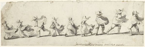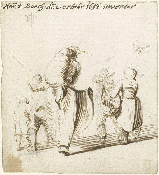 Curator: This is a quick ink drawing by Harmen ter Borch, dating from around 1650 to 1655. It's titled, "Studieblad met drie lopende vrouwen," or "Study Sheet with Three Walking Women," and is currently held at the Rijksmuseum. What strikes you about it? Editor: There’s a captivating immediacy to it. The women appear to be caught mid-stride. They’re so alive, as though sketched in a fleeting moment—you sense motion, burdened movement, the weight of work, even, in the angle of their bodies. Curator: Indeed. Ter Borch was celebrated for his intimate genre scenes, capturing everyday life with a delicate realism. This drawing offers a glimpse into his working method. It's fascinating to see the casual observation of figures in motion. Note the details on their caps. Editor: What is compelling is to wonder at what this fleeting glimpse really says, perhaps a deeper narrative about working women who were an under-recognized labor force that carried Dutch society on their shoulders, yet are rarely acknowledged as individuals. Their identity as women isn’t only about appearances or their place in the family structure, it's also about the world outside it. Curator: Certainly, we could see it through a feminist lens, recognizing the socio-economic contributions of women that were overlooked, and we can contextualize it further by seeing this art in galleries and museums—these institutions, historically dominated by a certain perspective— are places we re-interpret these images. Editor: Absolutely. Considering the underrepresentation of women artists and the subjects that represent women in mainstream art narratives, these artworks open our eyes. Curator: Thinking of Ter Borch's meticulous approach, this loose study served as preparation for larger, more polished works. Perhaps some of these very poses found their way into his more well known paintings of domestic interiors. Editor: Ultimately, Ter Borch's simple yet striking study offers so much—a slice of life but also potential commentary on gender, class and representation during the Dutch Golden Age. Curator: It reminds us how even the simplest sketch can hold layers of meaning, reflecting both artistic skill and the social realities of its time.