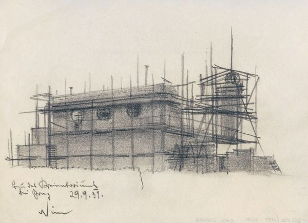 Henk Henriët made this drawing of a construction site with pencil on paper, but we don't know exactly when. It’s the kind of drawing that pulls you in with its delicate lines. You can see how Henriët built up the image, layer by layer, not just depicting a building but also revealing the process of its creation. Look closely, and you'll notice the scaffolding around the building, almost like a skeleton. It reminds me of drawings by Piranesi, who also used architectural subjects to explore themes of structure and form. What’s striking here is how the lines aren’t trying to hide anything. The texture of the paper, the varying pressure of the pencil—it's all part of the story. And then there are the figures, so subtly placed, giving a sense of scale. This drawing feels like a conversation, an open-ended exploration of space, form, and the act of building. It leaves you with a sense of possibility, much like Henriët’s later landscapes and figure studies.