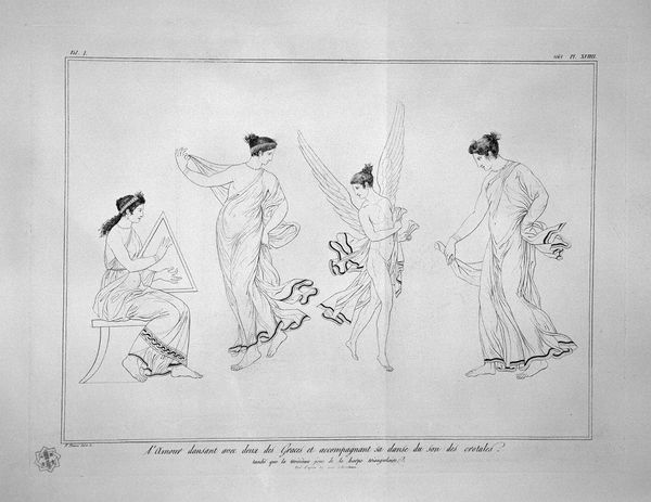 Curator: What strikes me first is how this scene, although meticulously rendered, feels almost…theatrical. Editor: It's an engraving, probably from a book illustration, by Giovanni Battista Piranesi. It shows a chariot race, specifically depicting the victory of one of the heroes competing for the daughters of Danaus. Curator: Ah, the Danaids! That immediately infuses the image with layers of symbolic weight. These women, punished in the underworld, forever filling leaking jars, represent futility. Here, a hero wins their hand—a triumph over that futility? Editor: Perhaps. Piranesi lived in a time when the rediscovery of classical antiquity shaped political thought. This engraving presents an idealized vision of Roman strength and virtue through linear design and attention to costumes. What are you looking at more closely, if you don’t mind me asking? Curator: The horses! Each one is a study in controlled power. The repeated motif creates a rhythm that mimics the movement itself. The contrast with the poised stillness of the women in the chariot is quite interesting. There's something stoic and resolute in their posture. Editor: I see it a bit differently. I'm struck by how static they seem despite being in the chariot, as though frozen in time, archetypes more than individuals. This links to the political purpose. The power of Rome isn't presented by single heroes or heroines, but through generalized displays of virtues such as order, duty, even decorativeness. I believe this might tie to the cultural obsession of his time with line and perfect human specimens. Curator: True, the overall effect suggests not raw emotion but an exercise in ideals. But the legend gives this additional layer: we, who understand it, are positioned to recognize the story, like being party of some mystery and conspiracy. Editor: And in Piranesi's time, it was almost like staging a political spectacle through art. This image participates in a broader discourse about empire and power during the height of European colonialism. Curator: An image laden with complex connections and coded information! I find it both unsettling and intriguing, knowing what stories can carry within. Editor: Indeed. It's a lens through which to view how the past has always been remodeled, reimagined, and employed. A vehicle to transport culture forward in time.