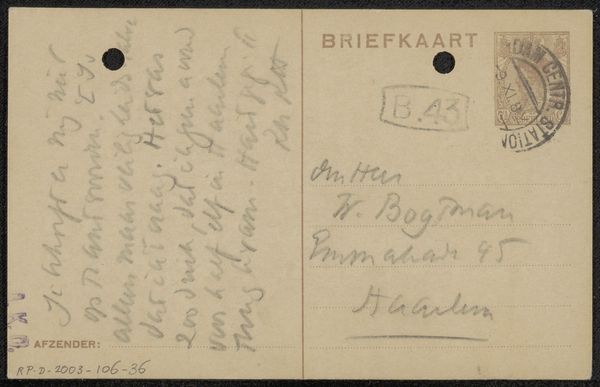 Curator: Alright, let’s turn our attention to “Uitnodiging aan Philip Zilcken,” a print dating roughly from 1884 to 1930. Editor: My immediate impression is that this invitation is incredibly unassuming, almost secretive in its simplicity. The golden and fading handwriting adds an intimate touch. Curator: Exactly! This work employs hand-lettering, featuring a unique blend of sand-serif and script typography. The combination creates a personal feel; imagine the act of handwriting each invite! It highlights a specific event: Philip Zilcken presenting "lithos by Bauer" at Pulchri Studio. Editor: The faded type almost makes it feel like a recovered artifact, doesn't it? Handwriting always carries so much more emotion than printed text, which creates an immediate and more significant connection to the past. Why do you think they used these particular letter forms? Curator: I'd wager that there's an aspiration to merge accessibility with artistry. The sand serif makes sure the key information can be read, while flourishes from the handwritten portion imbue sophistication. Editor: It speaks volumes about the value placed on this club and the art within it, I think. Not just anyone gets this invitation, but clearly folks "in the know" that the sender thought valued them enough to have a beautiful handmade invitation created. It reveals this little slice of cultural memory for us. Curator: The choice of gold-colored text hints towards the precious nature of both art and intellectual gatherings, don’t you think? What a statement for something small and seemingly practical! Editor: Definitely. And the term 'secretaresse' at the bottom, referring to Fenna de Meyier, reinforces that this communication isn't mass-produced corporate jargon but rather someone’s labor of love, and attention to the receiver. Curator: That's right, these thoughtful touches underscore not just its function as a mere notification but also as an art piece in itself. Editor: I like that thought—transforming what might seem quotidian into something quite profound. A lot can be said in even the humblest objects.