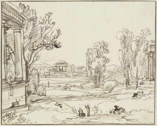 Franz Kobell made this artwork, titled 'Ancient Ruins, with a View of the Sun Setting Behind the Sea Horizon', using pen and brown ink with gray wash. The application of these materials is quite economic. With thin, wiry lines, the artist outlines the architectural forms, while the gray wash is employed with varied intensity to model shadows and create depth. Kobell captures a picturesque scene of crumbling, classical architecture, bathed in the fading light of the sun. This artwork's significance lies in its depiction of a romanticized past. By rendering the ruins in delicate ink and wash, Kobell evokes a sense of nostalgia and contemplation. The careful handling of light enhances this mood, lending the scene an atmospheric quality. While seemingly simple, the artwork reflects the artist's mastery of draftsmanship and an appreciation for the aesthetic potential found in ruins and the passage of time.