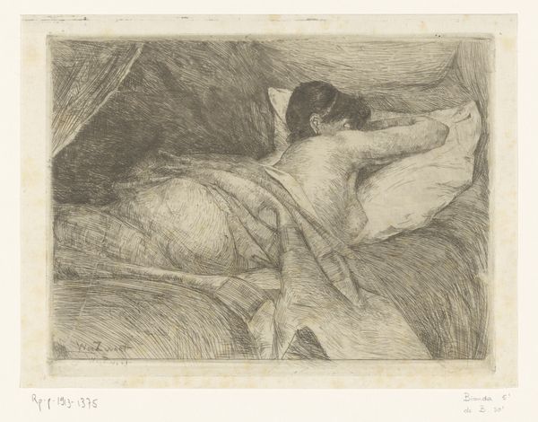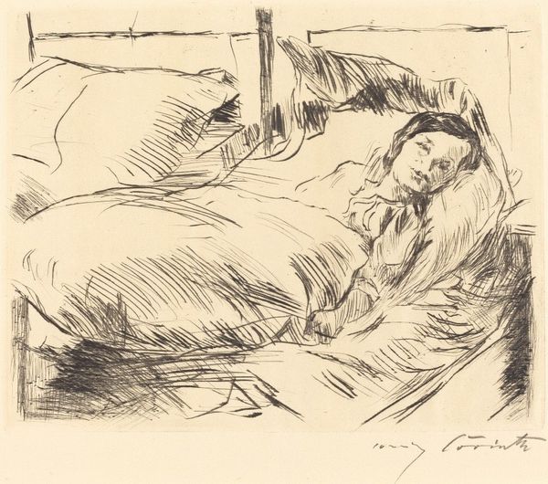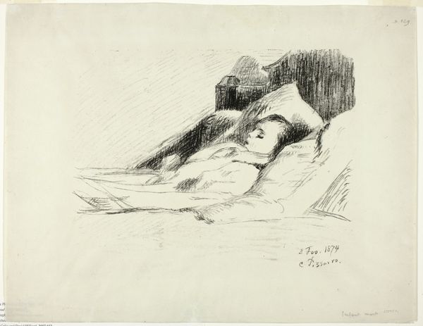 Curator: This is Käthe Kollwitz's "Unemployment," a pencil drawing completed in 1909. You can find it here at the Städel Museum. What’s your immediate response to this work? Editor: A stark weariness. The entire scene seems to sink under the weight of…something. Is it simply exhaustion, or something deeper, a generational resignation? Curator: Kollwitz had an incredible capacity for capturing profound emotional states, often tapping into collective anxieties. Notice how the sharp contrast and dynamic mark-making heighten the sense of tension and unease. The heavy lines create a dense, almost claustrophobic atmosphere. Editor: Absolutely. It feels essential to consider the context. 1909... Industrialized Germany, rising class consciousness. Unemployment wasn't just an individual misfortune; it was a symptom of systemic failings. Does the slumped figure in the foreground signify despair, and, if so, what is the cultural function of presenting despair? Curator: The symbolism here is particularly compelling. Observe the protective, almost maternal gesture of the woman in the bed, despite her own obvious exhaustion. Consider the way Kollwitz contrasts her exhausted gaze with the vulnerability of the children clinging to her. Is she a secular Madonna, sheltering her children from the cruel outside world? Editor: Or is the pose the result of something else; can the figures even eat? We're left to read their fate. Curator: A powerful reading! Her style itself is loaded with history. While rooted in social realism, there are undeniable elements of expressionism in its raw emotionality and distorted forms, but does her style humanize, or monumentalize these people? Editor: It forces confrontation. To see such vulnerability laid bare is profoundly unsettling, then and now. By portraying the brutal realities of unemployment, Kollwitz wasn’t just documenting; she was issuing a challenge. She presents to us people too easily unseen and too easily erased by historical narratives of success. Curator: Indeed, it’s a visual lament, but also an enduring indictment. Thanks for shedding further light on this drawing. Editor: My pleasure. It reminds us that art can be a vital act of bearing witness.
