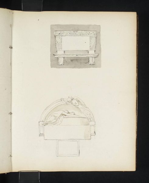 Curator: This is a sketch by John Flaxman, dating from around the late 18th or early 19th century. The drawing, part of the Tate Collections, measures approximately 199 by 156 millimeters. Editor: It evokes a sense of antiquity and solemnity, doesn't it? The sketch’s archway reminds me of funerary monuments, perhaps indicative of Flaxman’s own sociopolitical perspective regarding mortality. Curator: Note the economy of line. Flaxman reduced the forms to their most essential, achieving remarkable clarity. The composition is stark yet balanced, inviting contemplation on classical ideals. Editor: I see it as a meditation on power structures of the time, with the figure perhaps representing a critique of authority. It makes you wonder about the subject’s role in shaping societal norms. Curator: The beauty lies in the purity of its form, a testament to Flaxman's mastery of Neoclassical principles. Editor: I agree. This is a powerful statement on societal structures and individual agency.