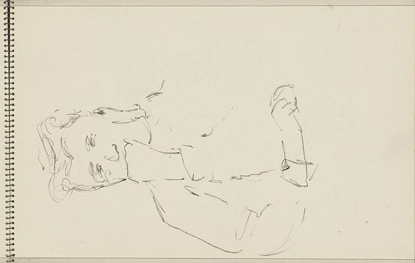 Editor: This drawing, titled "Reclining Female Nude," is by Isaac Israels and was likely made sometime between 1875 and 1934. The simplicity of the pencil on paper almost feels intimate. What symbols or deeper meanings do you see here? Curator: Consider how the reclining nude has evolved. Initially, such depictions were loaded with symbolism—fertility goddesses or moral allegories, where beauty equaled virtue. Over time, they shifted towards exploring form, technique, and the very nature of observation. Here, what remains of those older connotations? Editor: I guess I hadn't considered the symbolic history of the nude figure. It does feel different seeing it in this sketch, somehow more vulnerable and real. Curator: Precisely. It's about reinterpreting that visual vocabulary. How does Israels challenge our learned expectations, and invite us to witness a candid portrayal of the human form and also ideas of human identity that are free from those prior restraints? Think about the visual memory it stirs. Editor: So it’s not just a study of form, but also a commentary on how we’ve represented the female body? Curator: Yes, because the artistic practice carries meaning. Israels presents a nude but by avoiding overt idealization, and highlighting the everyday poses instead. This breaks down the barriers between high art and real-world observation and our expectations of its historical context, forcing viewers to question traditional artistic representations and what we can extract and carry forward from it into the current day. What do you think about that? Editor: That's really interesting! I see how it prompts a deeper engagement with the image and how representations have evolved. I'll never look at another nude drawing the same way again. Curator: Exactly, visual elements in art transcend their apparent definitions to tell cultural tales about societal expectations and artistic expression.
