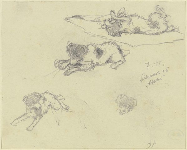 This drawing by Guillaume Anne van der Brugghen captures dogs in quiet repose. The primary symbolic focus is on the dogs themselves, creatures long associated with loyalty, guardianship, and domesticity. Throughout art history, the dog has held complex associations. In ancient Greece, Cerberus guarded the gates of the underworld, while in Roman society, dogs were both beloved pets and symbols of fidelity. This duality persists; consider the faithful hound at the feet of medieval noblewomen in tomb effigies, emblems of marital devotion. The image of a sleeping animal speaks to vulnerability and trust. Think of the countless depictions of sleeping children throughout art history, evoking innocence and the protective instinct. Van der Brugghen's sleeping dogs tap into this same wellspring of emotion. These depictions invite us to reflect on our own bonds with animals, and the comfort they provide. This is the power of images: to stir deep-seated memories and feelings, connecting us to a shared human experience across time.