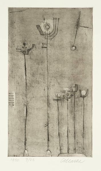Joseph Goto made this untitled print, Totemic Figures, in the late 20th century, using ink on paper. It's teeming with detail, a whole world rendered in delicate, spidery lines. Look at the way Goto builds up these forms, layer upon layer of tiny marks. It's almost like he's not just drawing figures, but conjuring them into being through the sheer act of mark-making. The lines are thin and precise, creating a sense of lightness and ethereality. The ink is consistent, a simple monochrome contrasting with the complexity of the forms. There's a sense of obsessive detail, of a mind lost in the act of creation, it makes me think of the work of Adolf Wolfli. For me this piece embodies the idea that art doesn't always need to be big or bold to be powerful; sometimes, it's in the quiet details that we find the most profound expressions of the human spirit. Art is a conversation, a back-and-forth between artists across time.