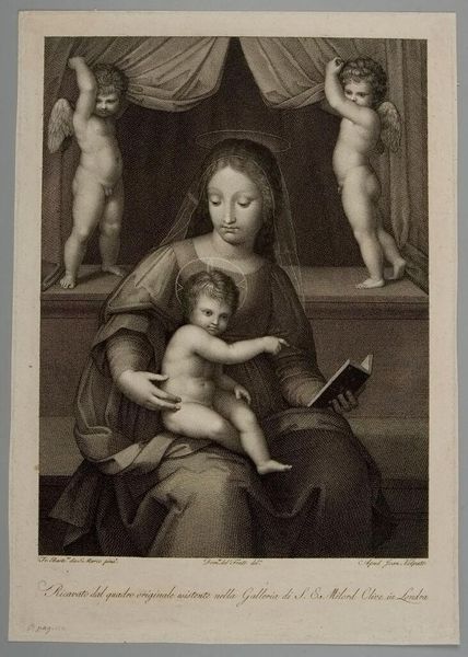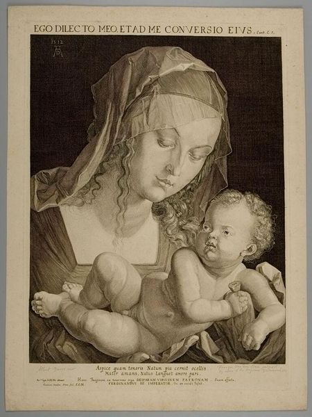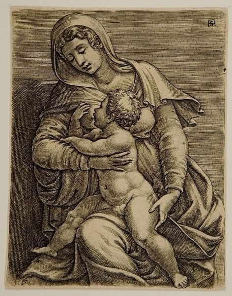 Curator: Looking at this print, "The Virgin with the Child and Saint Anne," crafted by Jeremias Falck in the 17th century, I'm immediately struck by the tender, almost fragile quality of the figures. Editor: Fragile is right. But also…a bit unsettling? There's a weight, a somberness, especially in Saint Anne's expression. It feels like a shadow looming over the idealized mother and child. Curator: That somberness, I think, points to the awareness of mortality, of the sacrifices inherent in the maternal role. Anne, in her position behind Mary, represents the lineage, the historical weight of motherhood. Editor: And the halos, faint as they are, barely separate them from the darkness. Are they symbols of protection, or just a reminder of their sacred burden? There's an intimacy here, sure, but it's tinged with melancholy, as if they already know the stories to come. Curator: Absolutely. It is a poignant reminder that even in sacred imagery, the complexities and burdens of familial bonds remain ever-present. Editor: It gives you a lot to ponder, this piece. It certainly made me think.