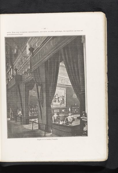 Curator: Here we have a fascinating piece entitled "Gezicht op een opstellingen van nationale fabricaten in het Franse deel van de Wereldtentoonstelling van 1885 in Antwerpen." It gives us a glimpse into the French section of the World's Fair in Antwerp, showcasing national products. This print combines photography and engraving and allows us to consider notions of national identity during the age of industrialization. Editor: My initial reaction is one of curiosity, bordering on skepticism. It feels almost like a staged photograph, cleaned and presented to reinforce a very particular, idealized vision of French craftsmanship and national pride. The high ceilings and ornate decorations certainly create a sense of grandeur. Curator: That's precisely what I find interesting here. World’s Fairs were fundamentally exercises in nation-building, opportunities for countries to project power, innovation, and cultural prestige on an international stage. This print would have circulated as propaganda of sorts, bolstering national identity by associating it with artistic achievement. The careful compositions featuring arranged artwork tell a particular story about French culture. Editor: It’s compelling to consider the unseen hands shaping the narrative. Who curated this particular display? Whose vision of "national fabricates" was deemed worthy of representation? And how did it reflect or perhaps distort the lived realities of the French artists and laborers whose creations were being showcased? This curated display begs questions about power dynamics, who has it, and what it conceals. Curator: Absolutely. The artist here isn't simply documenting; they're participating in a carefully constructed spectacle. Even the medium itself is revealing; combining photography with engraving allows for both accuracy and embellishment, underscoring the deliberate crafting of an image intended to influence perception. Editor: Looking closer, it appears these may not be just works of art. They are labeled as ‘national fabricates’. So where do we draw the line? Is it art, or industrial design? Or is that a deliberate blurring, where industrial manufacturing is celebrated as artistic innovation? What message is sent by positioning manufactured goods and artwork in the same line of sight? Curator: Well, these exhibitions functioned as engines of economic growth and geopolitical power, promoting imperial projects and solidifying existing hierarchies. But at the same time, they enabled the spread of new ideas, technology, and culture around the globe. This intersection creates new meanings in our analysis and challenges established ways of thinking about national heritage. Editor: In conclusion, it makes me think about the layers of propaganda that art can perform, even as it may display other valuable artistic purposes. Curator: It has certainly reminded me that art exists within complex systems of power, where image, ideology, and political agendas converge.