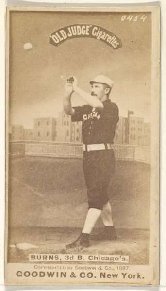 Curator: This gelatin-silver print, titled "Twitchell, Pitcher, Detroit, from the series Old Judge Cigarettes," was produced by Goodwin & Company in 1887. It now resides here at the Met. Editor: What a fascinating glimpse into a bygone era! The sepia tones give it this incredible sense of nostalgia. There's something almost theatrical about it, don't you think? Like a player caught between the stage and the baseball diamond. Curator: These baseball cards were actually inserted into Old Judge Cigarettes packs as a marketing tactic. This was a hugely popular method for promoting all sorts of products in the late 19th century, intertwining popular culture with the burgeoning advertising industry. Editor: Oh, that explains the slightly staged feel, doesn't it? And the slightly dreamy backdrop of a rooftop field... So, baseball, tobacco, and photography all rolled into one collectible item. I wonder if Mr. Twitchell ever envisioned his portrait hanging in a museum one day? Curator: These cards democratized portraiture in a way. Prior to this, a professional portrait was an item of status. All of a sudden everyday people could have a mass produced portrait, albeit one intended to sell cigarettes, of famous sports figures. They reflect an increasing focus on celebrity and sport as accessible forms of popular entertainment. Editor: I love how seemingly mundane objects can unlock such rich stories about society and culture. The image has a vulnerability; he looks so young! Curator: These Old Judge Cigarette cards offer a tangible connection to the Gilded Age and highlight how mass production techniques can reshape our relationship with representation, fame, and leisure. Editor: It's funny to think of baseball cards as being some of the earliest influencers! This has completely shifted my perspective. Thanks for that.