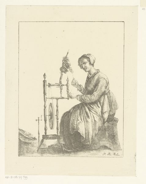 Editor: This is "Oldtid - Nutid," or "Past - Present" by Gerhard Ludvig Lahde, created in 1815. It's an engraving, and there's a quiet domesticity to it, a woman working a spinning wheel. What strikes you most about it? Curator: Well, the title itself, "Past-Present," immediately makes me consider the artwork in terms of historical and societal transitions. This isn't just a genre scene; it's a commentary on the changing role of women and labor during the Romantic era. How does the industrial revolution affect these roles and traditions? Editor: I hadn’t thought about that, I was just focusing on her stillness. But thinking about it now, is it saying that this tradition is under threat? Curator: Precisely. The spinning wheel represents a pre-industrial mode of production, a craft-based economy that was rapidly being displaced. Where is this woman situated in this societal transition? Her traditional dress reinforces her connection to the past, and invites us to question its sustainability. It also reminds us about labour as part of women’s cultural and social identity. Does the print's romanticized style gloss over the harsh realities of women's work at the time, do you think? Editor: It probably does. But the presence of the books suggests an openness to intellectual and cultural ideas that surround her. That’s quite clever. Curator: That's a key element. Those books point towards emerging literacy and potentially a shift in gendered expectations. The scene encourages us to investigate what this transition implies for women and their future roles in society. So this makes this domestic scene inherently political. Editor: It's interesting to see it not just as a quiet scene, but as a point of reflection on how social changes shape identity and the value of women’s work. Curator: Exactly! And how those issues continue to resonate today. It's about the tension between what we inherit and the choices we make in a rapidly evolving world.