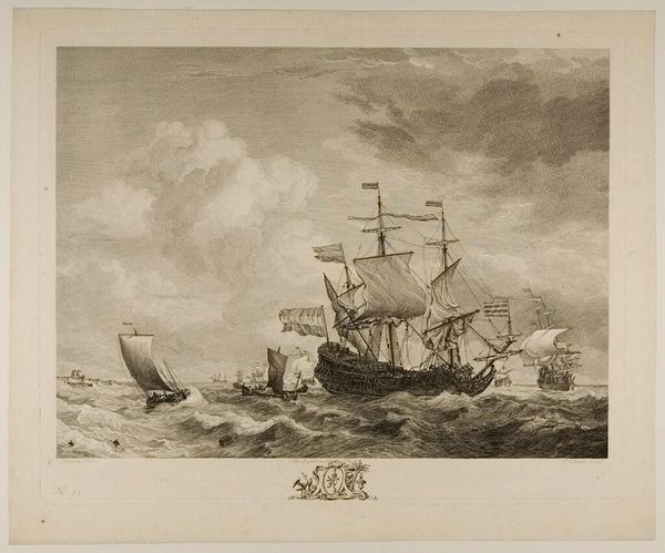 This print, "Vloot op een onrustige zee", was made by Pierre Charles Canot, sometime in the 1700s. It's an etching, meaning that the image was incised into a metal plate, inked, and then transferred to paper. What I find compelling about prints like this is the way they capture the spirit of industry and commerce. The labor of the sailors is front and center, braving the "onrustige zee," or "restless sea," as the title says. But, also consider the labor involved in producing the print itself. Think of the skilled engraver, carefully translating the scene onto the copper plate. This was a painstaking, time-intensive process, demanding precision and control. The finished print could then be reproduced in multiples, and distributed widely. This speaks to a whole system of production, distribution and consumption, not unlike the global networks of trade that these ships represent. So, next time you look at a print like this, don't just see a pretty picture – consider the layers of work and context embedded within it.