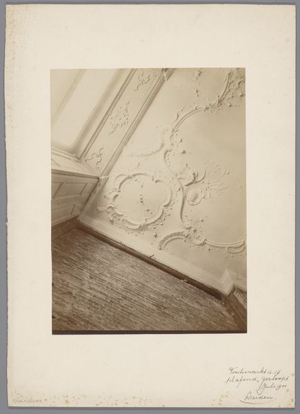 Editor: This photograph, taken sometime between 1900 and 1915 by an anonymous photographer working for Monumentenzorg, depicts a decorated ceiling inside a house on Noordeinde 140 in The Hague. I’m struck by the detail and intricacy of the plasterwork. What can you tell me about this photograph and the craft behind that ceiling? Curator: Well, it highlights the labour involved in creating decorative features for domestic spaces. Forget "high art," let's examine the process. These ceilings weren't produced by lone artists, but teams of plasterers. How does this affect its value? And where do we draw the line between art and craft, especially when labor becomes industrialized? Editor: So you’re saying the image makes us question the hierarchy we place on different forms of creation? I hadn't thought of it that way, I was simply admiring the craftsmanship. Curator: Exactly! The photo is a historical document, not just of aesthetics, but of labour practices. Think about the materials – plaster, likely sourced locally. Consider the social context – a wealthy household affording such ornamentation. It begs the question, who profits from this level of artistry? And how are the materials acquired and transformed through the hard labor that we do not often think about? Editor: I see. It’s about uncovering the story behind the visual. Considering who made it and what was required of the making. Curator: Precisely! By focusing on production, materiality and even the consumption by the wealthier population of the day we gain insights often overlooked in traditional art analysis. Editor: This reframes the photo from just a decorative ceiling to a window into the social and economic structures of the time. Curator: It’s about considering the real lives and hard work required to create all this intricacy. Thank you for opening my eyes even more to that reality.