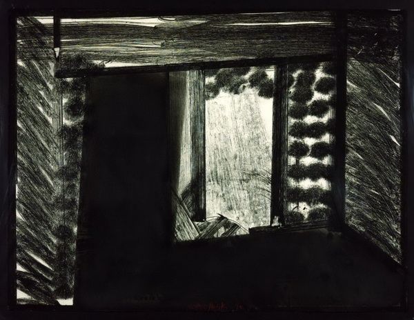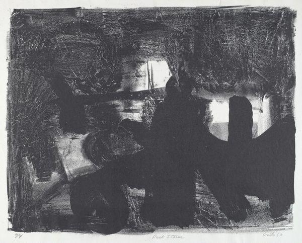 Editor: We're looking at "Seated Man," a 1964 graphite drawing by Arthur Hall Smith. It's... striking, almost haunting, with the figure emerging from such a dark background. There's an immediacy in the line work. What do you make of it? Curator: Haunting is spot on, I think. For me, it evokes the feeling of glimpsing a half-forgotten memory. That intense contrast and those sketchy lines – they almost refuse to fully materialize the figure. What strikes me most is how it teeters on the edge of abstraction; it is clearly a man sitting, yet it could so easily dissolve into pure form. Does that resonate with you? Editor: Absolutely. It’s like the essence of a man, rather than a literal depiction. The artist seems less concerned with anatomical correctness and more with capturing…a feeling. What does this abstraction do? Curator: It pulls us in, doesn't it? The incompleteness invites our own projections, our own experiences of solitude or contemplation. Given its creation during the abstract expressionist era, Smith could have been exploring themes of existentialism or the fragmented nature of modern identity. He is not providing answers, you see, but provoking introspection, almost daring the viewer to complete the picture. It feels very raw. Editor: It certainly leaves you with a lot to consider. I like how you describe the work, the feeling of half forgotten memory that is emerging here and there. Curator: And I now appreciate how Smith is daring us to put our memories on that paper too, as an active part of seeing it!