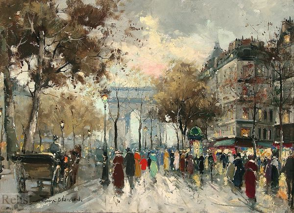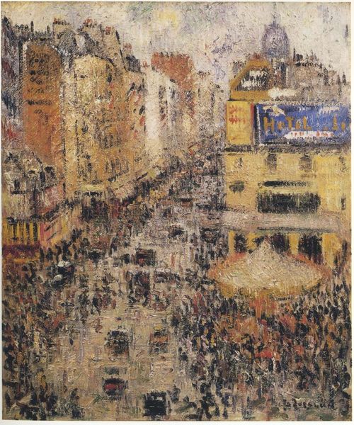 Editor: Here we have Konstantin Korovin's "Paris," painted in 1933 using oil paints. It evokes a sense of nocturnal hustle and bustle reflected in rain-slicked streets. The city lights create such dynamic reflections... What do you see when you look at this painting? Curator: What strikes me is the calculated use of impasto. Notice how Korovin has applied thick layers of paint to capture the ephemeral qualities of light and reflection. The composition, while seemingly chaotic, adheres to a structured arrangement. The verticality of the trees and buildings juxtaposed against the horizontal street creates a compelling visual tension. Editor: So you are saying the seeming randomness is carefully constructed? Can you elaborate? Curator: Indeed. Observe how the brushstrokes, while appearing spontaneous, contribute to a carefully considered structure. Note the deployment of contrasting colours—warm ambers and golds of the streetlights against the cool blues and greys of the Parisian sky, not unlike the way that Monet used to orchestrate a visual symphony of light. Editor: The colours do dance across the canvas. It’s like he’s captured a moment of shimmering transience. I hadn't noticed how carefully structured the composition is before. Curator: Consider too the materiality of the paint itself. The texture, the viscosity – it all serves to enhance the tactile and visual experience. What initially appears to be a simple landscape reveals, upon closer inspection, a complex interplay of form, color, and texture. Editor: It’s amazing how much deeper our understanding can get when focusing on those elements. I’ll definitely pay more attention to brushstrokes and texture in other works now!