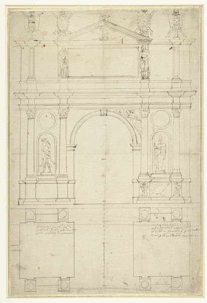 Editor: This 18th-century drawing, "The Arch of Titus, Rome," by an artist from the British School, is quite striking in its simplicity. It evokes a sense of faded grandeur. What do you see in this piece? Curator: The Arch, then and now, is loaded with symbols, not just of imperial power but also of triumph over adversity. The inscription itself—"To the Divine Titus Vespasianus, Augustus"—speaks volumes. It highlights the Roman deification of emperors, linking earthly authority to the divine. Editor: Divine authority through architecture? Curator: Precisely! Consider how the arch visually narrates Titus's victory in the Jewish War. These symbols, though created in antiquity, resonate across centuries, shaping collective memory. This image shows the cultural memory and continuity. Editor: It is fascinating how a simple sketch can hint at such a complex history. Curator: Indeed. A work like this shows the weight of cultural symbols, and how they affect us all even now.
