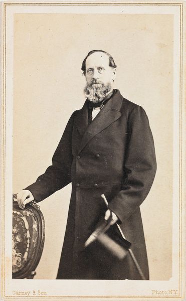 Curator: This albumen print, likely taken in the 1860s, captures the portrait of a distinguished gentleman by John and Charles Watkins. The inscription "Parliament St." suggests it was produced in their London studio. It is currently held at the Metropolitan Museum of Art. Editor: There's a melancholic air about this portrait, isn't there? The sepia tones, the slightly blurred edges—they create this impression of looking into the past, but a past tinged with a subtle sadness. I find it very affecting. Curator: Yes, the sitter’s direct gaze is engaging. There’s a certain uniformity in the clothing of the era: the dark suit, light trousers. But those full side whiskers are really interesting. They may convey status. A man of prominence signaling himself through adornment. Editor: His clothing does much of the work to shape our perception. Take away the waistcoat, the subtle chain hanging from the button, and it’s an entirely different narrative being told about status. Also, how precisely is his cane being positioned? Propped across his hand it almost comes off as a weapon to show defiance and control. Curator: That cane certainly lends to a certain persona. He possesses this sense of establishment, and even of constraint that resonates with a historical understanding of gender identity in the period. He holds it very casually. This photo almost attempts to negotiate power relationships as a symbol, or at least allude to one, but that symbolism might have also represented his position. Editor: Thinking of its semiotic structure, the albumen print itself is significant. As an early form of photographic reproduction, it was often used for portraits intended for mass circulation among family members. Curator: Right, these weren't just artworks, they were tools for maintaining connection and preserving lineage. As a photo image of a sitter they become a symbol, too, connecting one person’s lineage to the values and ethos of the society it inhabits. A very common but intimate tradition during that time. Editor: Precisely. It really goes to show how an image can become more than its subject; how it can encode and transmit meaning across generations. Curator: Definitely an experience, and the Watkins photography firm was important during that era in London. These clues create an experience when visiting an archive or museum setting and one gains deeper awareness on visual communication. Editor: Well, exploring that period and style of this composition made us consider not only what we're seeing but the whole context around it.