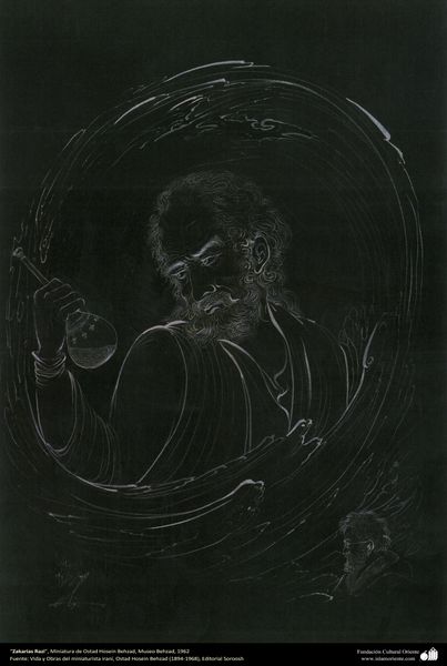 Curator: It's like a whisper in ink, isn't it? Editor: Absolutely, a quiet intensity. The stark palette focuses my attention on the detail; what can you tell me about the drawing itself? Curator: Hossein Behzad created this portrait, entitled "Saadi", in 1964. Behzad was a master of Persian miniature painting, so this intimate scale feels quite natural. Looking closely, we can see that ink is used with incredibly fine lines. Editor: The linear precision, especially around the face and turban, is exquisite. And this striking inversion--using light lines to define the form against that inky background...it really accentuates the subject's gaze. Almost a glow emanating from within. It's quite unusual for this kind of orientalist drawing, wouldn't you agree? Curator: The luminosity evokes Saadi Shirazi’s spiritual insights. I always thought this way of drawing might signify an effort to unveil something sacred, an echo of wisdom only available when peering beneath the obvious. Plus, notice his expression: it suggests not just profound thought, but invitation. He holds a book but extends a hand. He's not just learned; he wants to share. Editor: An interesting duality indeed! His gaze definitely grabs my attention. He almost knows I’m watching him! You can see him caught between gesture and holding still; the formal arrangement seems balanced, and his posture suggests he’s ready to impart his vision or teachings. The composition allows viewers to consider what it might be that he seeks to impart. Curator: Right. In this miniature, a profound respect comes through—for Saadi himself, yes, but also for the entire tradition of Persian art, literature and philosophy he represents. And it feels quite modern. I love when artists like Behzad manage to breathe fresh life into these antique styles. Editor: I agree! Behzad's unique blend is truly beautiful here: by embracing historical context alongside innovation, he makes the drawing memorable while keeping the original tradition of Saadi alive and approachable. It’s a great fusion.