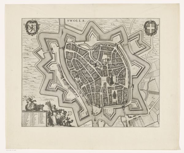 Editor: Here we have “Plattegrond van Frankenthal,” a drawing and print made sometime between 1643 and 1690 by Matthäus Merian I. I’m struck by the intricate details and the rigid, almost militaristic layout of the city. How do you interpret this work? Curator: It's a fascinating visual record. Notice how the city itself is contained within a star-shaped fortification. This wasn't just about aesthetics; it was deeply symbolic of protection, order, and control. The star, throughout history, has been associated with guidance and destiny. Editor: So, the shape isn’t purely functional? Curator: Not entirely. The shape reflects a specific type of power being exerted here. Each point is strategically placed to deflect attacks. The map is densely packed with miniature symbols which create the feeling of walking the space, so in fact the representation has as much, if not more impact than the built environment. It’s not simply a layout; it's a symbolic assertion of dominance and security during a tumultuous period in European history. Do you notice other symbols? Editor: I see a crest at the top, but I don’t know what it represents. Curator: That crest is a heraldic symbol, signifying the authority and lineage associated with Frankenthal. It acts as a visual shorthand, immediately conveying the city’s established status and power. In heraldry, everything—colors, animals, shapes—tells a story about the family's or city's identity, virtues, and history. Consider this work an entire world of visual cues rooted in shared cultural understanding. Editor: It’s incredible how much information is conveyed through these images! I’ll definitely pay closer attention to the symbols in artworks moving forward. Curator: Exactly! These elements allow the artwork to exist across centuries and languages, echoing across our minds.
