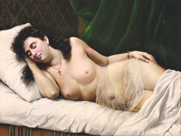 Curator: Rev. Matthew William Peters, an artist who later became a clergyman, painted "Lydia," now hanging in Tate Britain. It's quite intimate in scale, just over 64 x 77 cm. Editor: My first impression is how theatrical it feels—almost staged. The heavy shadows and her direct gaze are intensely captivating. Curator: The artist's complex relationship with the Royal Academy, his clerical duties, and even societal expectations all shaped how a work like this would be received. The politics of imagery were certainly at play. Editor: Absolutely. We must also consider the power dynamics inherent in the male gaze and the vulnerability projected onto Lydia. How does this painting participate in the objectification of women? Curator: And how did its display and reception influence public perceptions of femininity and morality within the context of the art world and beyond? Editor: It’s a layered image; Peters forces us to confront both the beauty and the discomfort within this representation. Curator: Indeed, it provides us with an insight into both the artist and the culture of the time. Editor: Leaving us with a disquieting sense of the complexities surrounding art and representation.