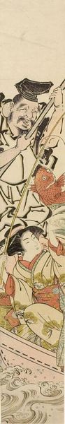 Editor: So, this print, "Woman and Dog under New Year's Decorations" by Torii Kiyonaga, feels very serene. What strikes you about it? Curator: Consider the context. Kiyonaga lived during a time of relative peace and prosperity. How might that have influenced the imagery he chose to depict? Editor: Well, I suppose the calm scene reflects that peace. It seems like it's suggesting an ideal of feminine grace and domestic tranquility. Curator: Exactly! Kiyonaga's prints often depicted women in idealized roles, reflecting and shaping contemporary societal expectations. How do you think its display in a Western museum impacts its meaning today? Editor: I hadn't thought of that. It definitely makes me consider the historical and cultural framing differently now. Curator: The power of display.
