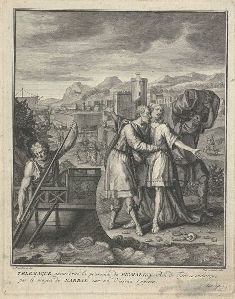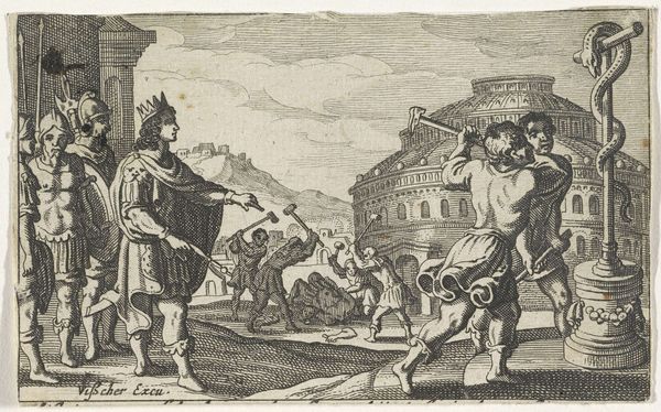 Editor: Here we have Arnold Houbraken’s engraving, "Hendrik, graaf van Holstein temt een leeuw," created sometime between 1681 and 1699. The linear quality immediately caught my eye. What visual elements strike you as significant? Curator: The formal arrangement presents an interesting dichotomy. Consider the relationship between the textures created through the engraving technique. We see tightly packed lines giving way to sparse marks to distinguish the planes. Do you see how the artist contrasts the muscularity of Hendrik with the almost decorative mane of the lion, using line variation? Editor: I do now. The difference in line weight and density really sets them apart. But, what about the structure of the overall composition? It feels almost stage-like. Curator: Precisely. Note the architecture and the figures on top, how it frames the central action. The strong vertical lines of the building create a sense of stability, almost as a visual counterpoint to the implied movement of the lion, or the hero. Editor: That’s a great point. And those figures on the building; do they add another layer to the scene? Curator: Undeniably, those figures add another plane to the drama, while not part of the core, they frame our understanding and offer another element to dissect through the image itself. Ultimately, Houbraken seems interested in capturing form through line, focusing more on structure than texture in defining this historical narrative. What do you take away? Editor: It is fascinating how much the formal elements contribute to understanding the scene’s dynamic. Curator: Indeed, this piece demonstrates how studying line, form, and composition can enhance appreciation and open a richer narrative interpretation.