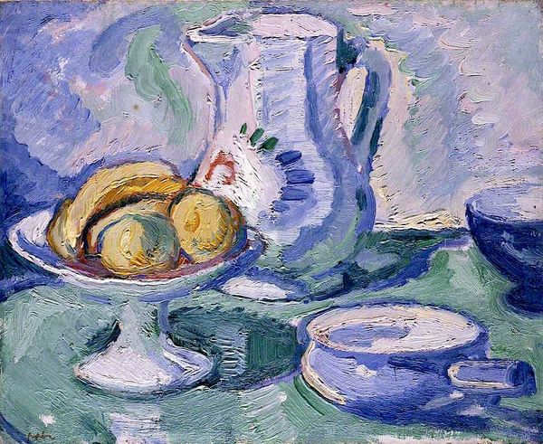 Curator: What strikes me first about this oil painting, "Jug," is how Renoir seems to capture light itself, almost dissolving the solidity of the object. Editor: I agree. And note how that light refracts across a ubiquitous vessel like the jug. Jugs are primal in almost every culture. Curator: They are fundamental. Universally, jugs symbolize hospitality, nourishment, and communal gatherings. One is reminded of the endless tales of shared libations, sacred fluids, even humble water offered from such a vessel. The very idea of holding and pouring from a jug touches deep cultural chords. Editor: It is the shape too. Consider its curvilinear form: soft and voluminous with circularity and spiraling. Renoir highlights it even more with those strokes, suggesting an abundance both materially—paint—and conceptually. But then it has this flattening effect, as well. The composition seems determined to sit still in the picture plane. Curator: I think it's Renoir's visual language which conveys a feeling of everydayness imbued with warmth. He does this by embracing soft forms, a somewhat restrained palette that suggests domestic tranquility rather than heroic grandeur. There are all these implicit layers about simple human experiences. Editor: Right. This moves the Jug beyond still life. Renoir employs subtle variations in hue. He carefully renders the modulation of tone on the handle that communicates its weight, for instance, that also directs the eye through an implied structure. So it’s like a silent performance captured in oil. The tension is in its form. Curator: This makes me think of similar objects like chalices and goblets—but this ordinary vessel celebrates something beyond any rigid set of rites. Editor: Precisely. So, if one ponders the art of painting like this in order to arrive at some kind of profound message then this can easily reveal our contemporary needs for an art that does not require some over-burdening system of meanings. Curator: It does allow the observer an open connection through something fundamentally, existentially shared. Editor: Ultimately, I admire how Renoir’s technique and subtle mastery creates an encounter between object, artist, and ourselves, almost invisibly revealing the deep structure within even the simplest of forms.