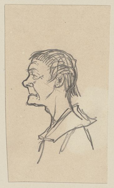 Johannes Tavenraat made this drawing called 'Kop' using pen and brown ink on paper in the 19th century. The drawing presents a study of a head in profile, characterized by loose, expressive lines. The materiality of the ink on paper gives the sketch an immediate, almost ephemeral quality. The linear structure suggests a face marked by age, and the quickly drawn hat seems to contain, or perhaps barely restrain the subject. This work can be considered as a study in capturing the essence of form through minimal means. The semiotic weight of the lines and the forms they create evoke a feeling of fleeting observation. It questions how much detail is required to convey character and presence. It captures the essence of a subject through suggestion and the power of suggestion destabilizes any fixed interpretation. Note how Tavenraat used ink to create a study that conveys the subject's essence with such simplicity, encouraging us to contemplate the act of seeing and representing.
